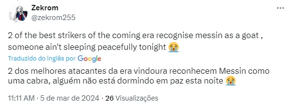 Agora, o centroavante do Manchester City falou sobre o assunto e exaltou o argentino, o colocando como o melhor jogador de todos os tempos. Confira o trecho, publicado por Ian Cheseman:
