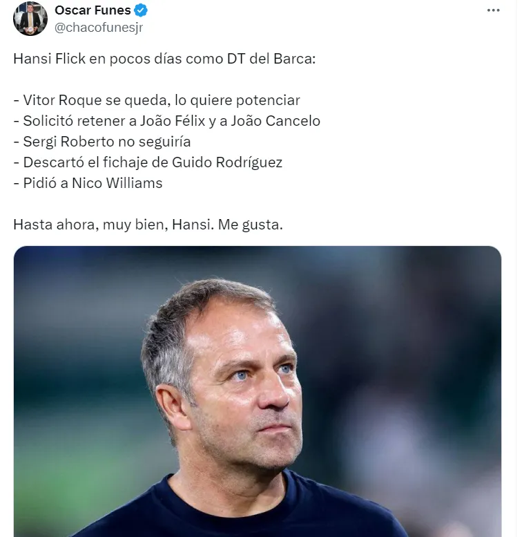Uma das importantes ações que Flick tomou tem relação com o brasileiro Vitor Roque, que termina a temporada em baixa. Segundo o jornal Sport, o comandante comunicou ao clube que deseja contar com o atacante na temporada 2024-25.
