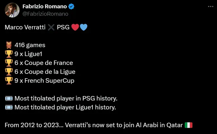 Verrati é um dos maiores ídolos da história do PSG. Ele defendeu as cores do clube de Paris por longos anos, chegando a totalizar 416 jogos oficiais, além de 29 títulos coletivos.