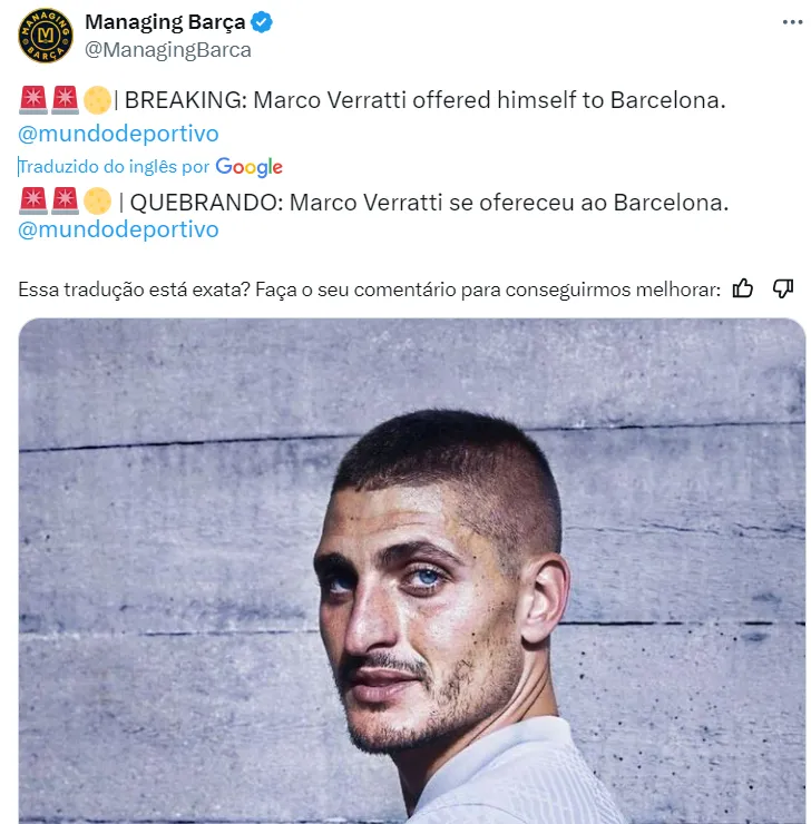 O Barcelona tem a possibilidade no mercado da bola de realizar a contratação do italiano Marco Verratti, ídolo do PSG e, atualmente, jogando no futebol do Catar, com as cores do Al-Arabi.