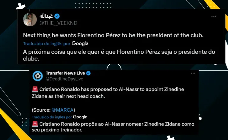 Informações do jornal Marca, da Espanha, dão conta que Cristiano Ronaldo pediu ao Al-Nassr a contratação de Zidane como uma opção para assumir o comando do clube, já que Luis Castro corre risco de ser demitido. A notícia está sendo bastante repercutida na imprensa da Espanha e também na Arábia Saudita.
