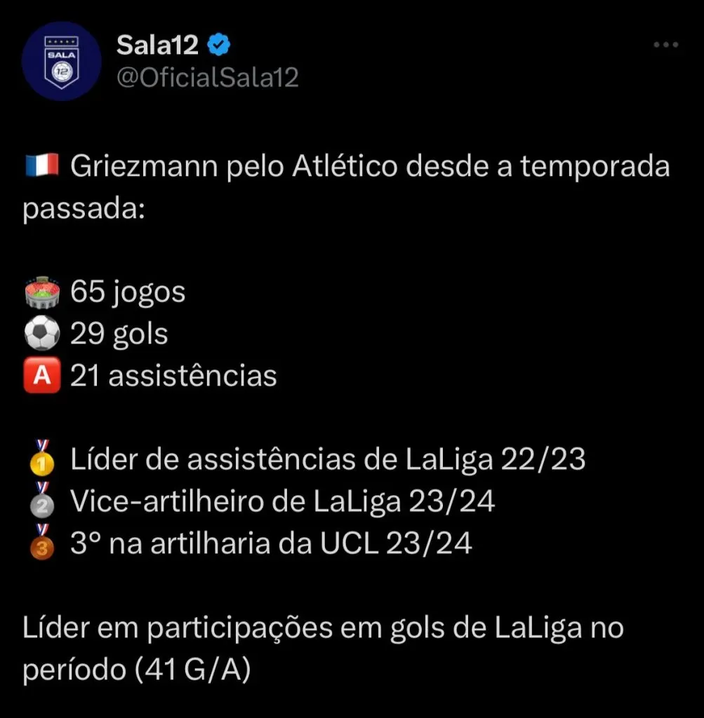 Antoine Griezmann faz uma excelente temporada em 23/24, acumulando 12 gols e uma assistência em 16 jogos, sendo peça importante do elenco de Diego Simeone.