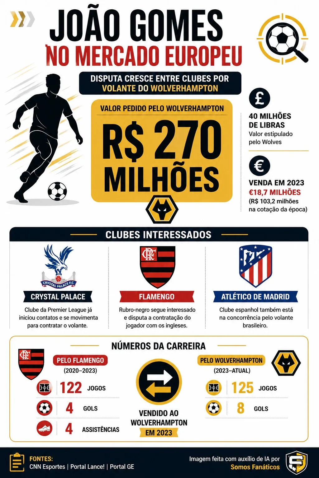 No início de 2023, apesar das investidas do Lyon, o Flamengo vendeu João Gomes ao Wolverhampton por 18,7 milhões de euros (R$ 103,2 milhões na cotação da época), segundo o portal GE.