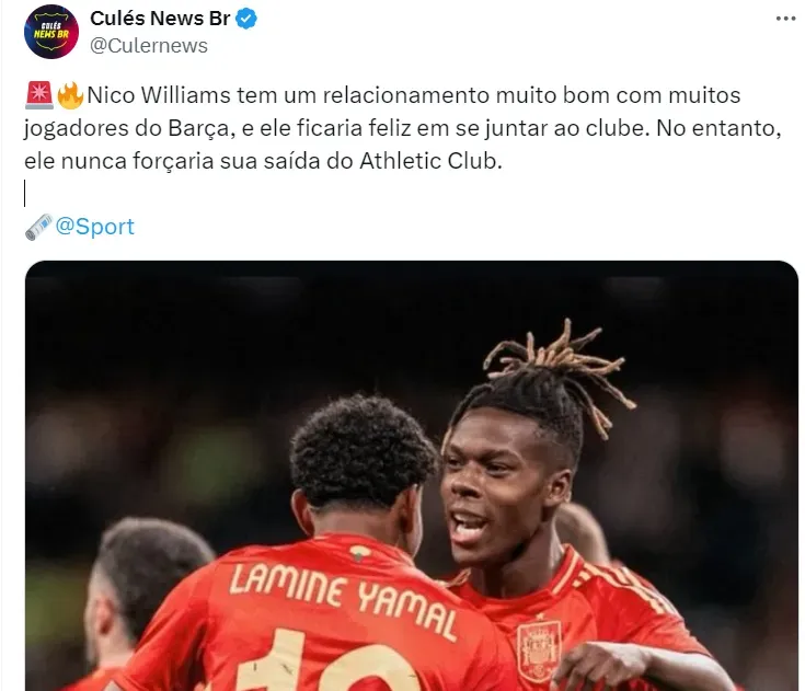 O jornal Sport frisa que o jovem jogador do Bilbao está aberto a se mudar para o Barça e ficaria feliz em se juntar ao clube, mas não vai forçar uma saída do clube Basco para jogar no time do técnico Xavi.