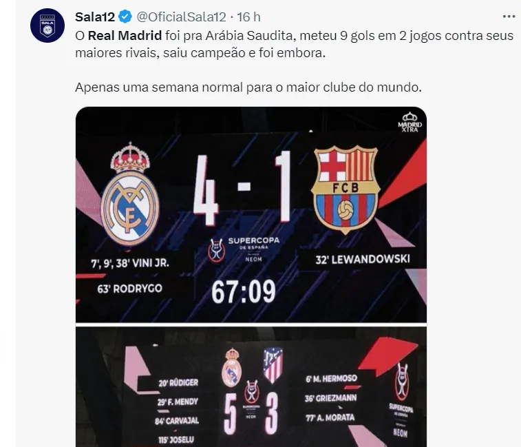 No último domingo, o Real Madrid enfrentou o Barcelona pela grande final da Supercopa da Espanha e bateu o rival espanhol pelo placar de 4 a 1, com show do brasileiro Vinicius Jr., autor de três gols.