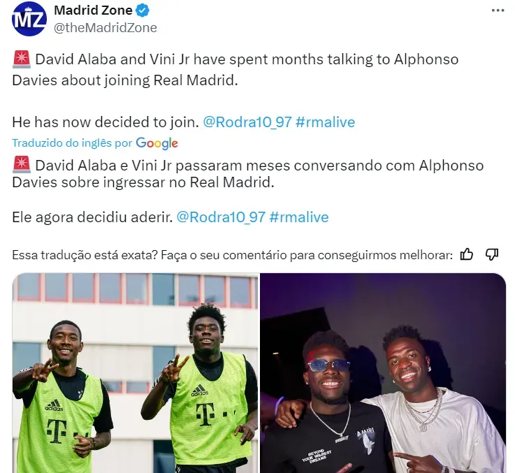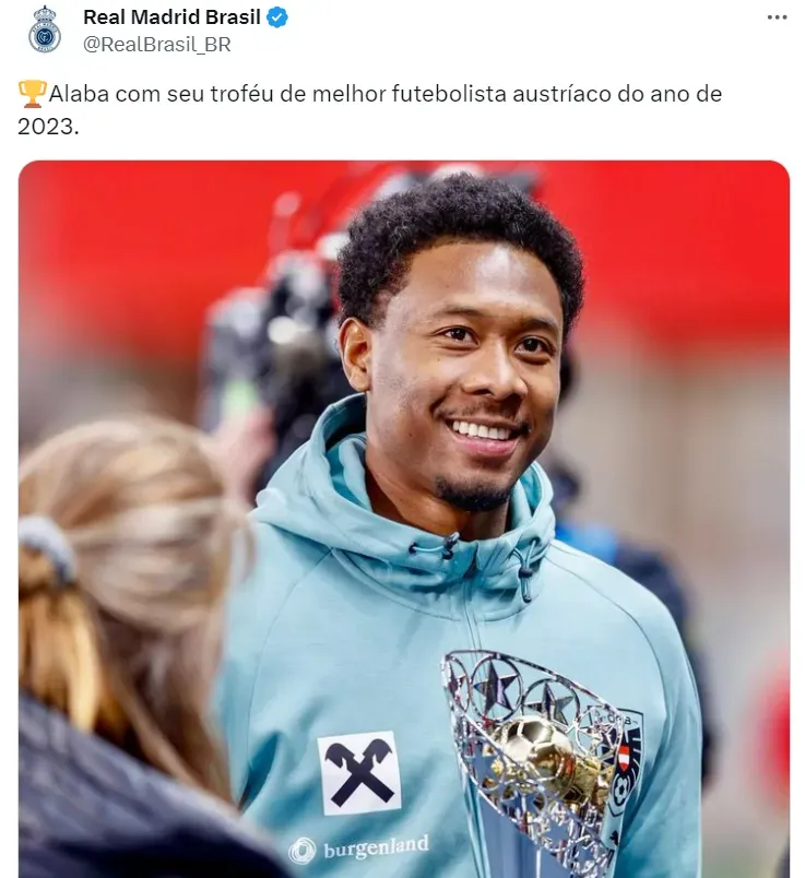 Alaba chegou ao Real Madrid na temporada de 2021, depois de fazer história com as cores do Bayern de Munique, e tem contrato com os merengues até o ano de 2026. Dentro do clube, não há nenhuma intenção em negociá-lo.