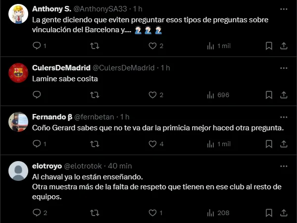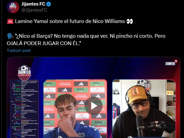 “Nico (Williams) no Barcelona? Não faço projeções, nem crio tendências, mas afirmo que gostaria de jogar com ele”, respondeu Lamine quando questionado sobre as especulações.
