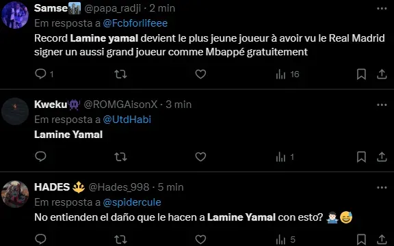 Lamine Yamal começou a jogar futebol nas ruas de Esplugue de Llobregat até ser descoberto pelo Barcelona e fazer as categorias de base no clube do Camp Nou. Ele tem 16 anos e é titular na equipe catalã.