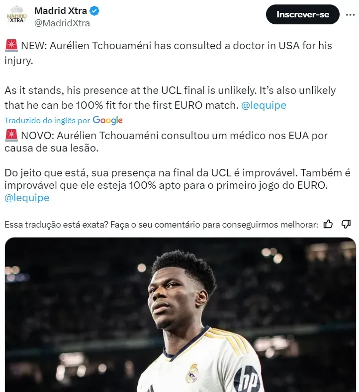 Para o duelo contra o Dortmund, é improvável que Tchouaméni esteja apto até mesmo no banco de reservas. O volante, titular absoluto, consultou um médico particular nos EUA e sua presença para a final é improvável. Inclusive, segundo o jornal L’ equipe, o francês é dúvida para o primeiro jogo da França na Euro.