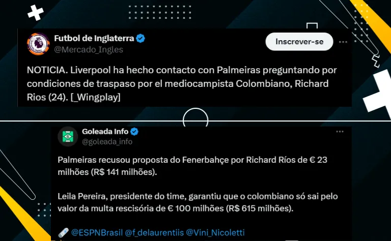 O Liverpool segue atento no mercado de transferências e abriu os primeiros contatos para entender mais sobre a possibilidade de um possível negócio envolvendo o meia Richard Ríos, do Palmeiras, alvo de outros gigantes do futebol europeu, tais como Manchester United e PSG. A informação é do perfil WingPlay.