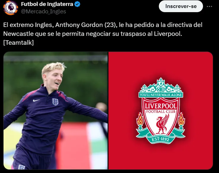 Segundo informações do portal inglês TEAM Talk, o atacante Gordon, do Newcastle, e que estava na Eurocopa, informou ao clube do nordeste inglês que deseja jogar no Liverpool.