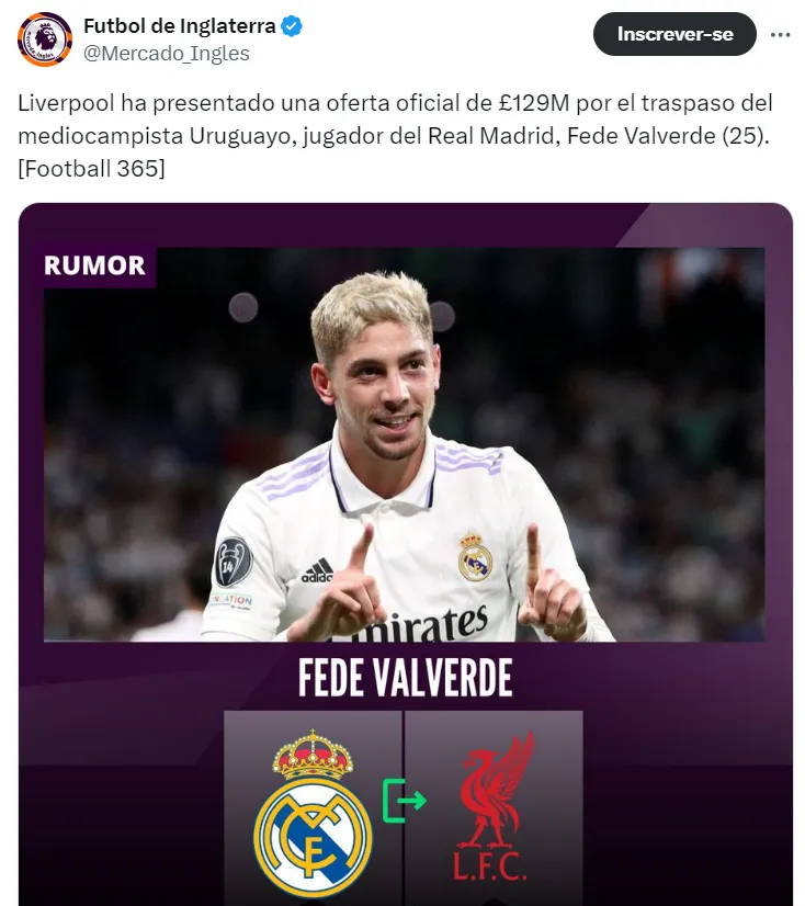 Os Reds estão interessados no futebol de Valverde visando a próxima temporada, mas os olhares para o meio-campista acontecem há um bom tempo. No entendimento do clube inglês, Fede é um atleta de casse mundial.