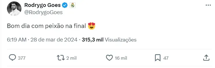A proposta do Liverpool para ter Rodygo na próxima temporada é avaliada em 80 milhões de euros e o clube merengue já está ciente do movimento dos Reds. Segundo a fonte, essa é a segunda tentativa do time inglês pelo brasileiro.