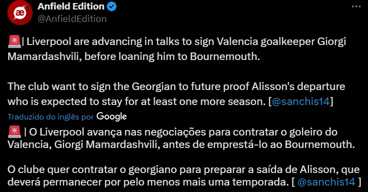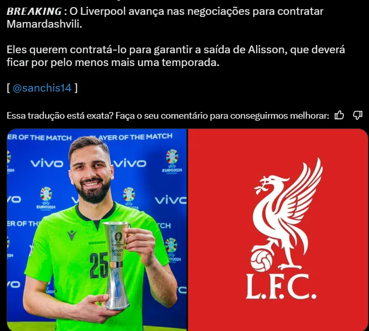 Temendo perder seu grande titular, o Liverpool decidiu que tentará a contratação do goleiro Giorgi Mamardashvili, de 23 anos de idade, do Valencia, e que fez uma enorme Eurocopa vestindo as cores da Geórgia.