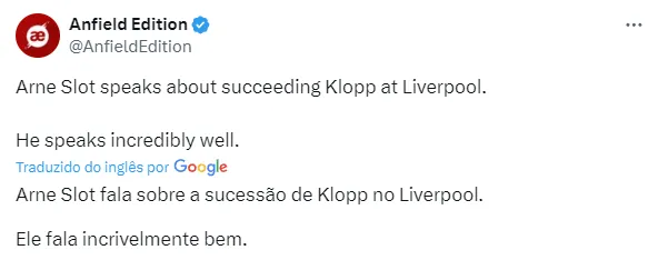 Klopp deixou, oficialmente, de ser o treinador do time. O alemão será substituído por Arne Slot, que vinha fazendo um grande trabalho sob o comando do Feyenoord, da Holanda.
