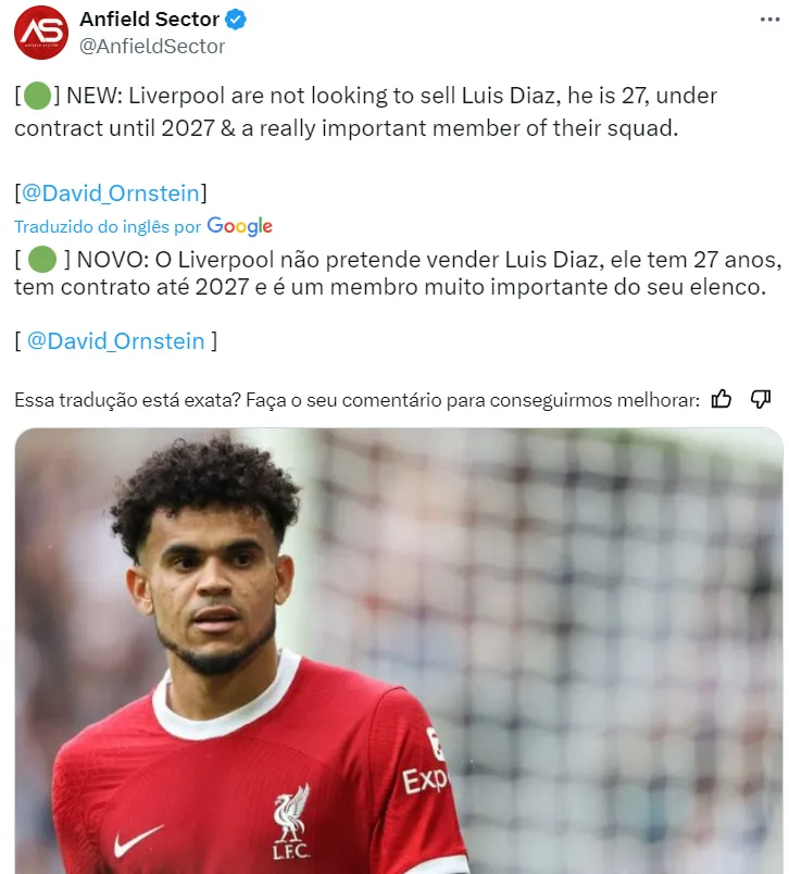 Em meio aos rumores tomando conta do atacante colombiano, o Liverpool decidiu que não vai abrir qualquer tipo de negócio envolvendo o nome de Díaz: ele tem contrato até 2027 e é bastante importante para o elenco, informa David Ornstein.