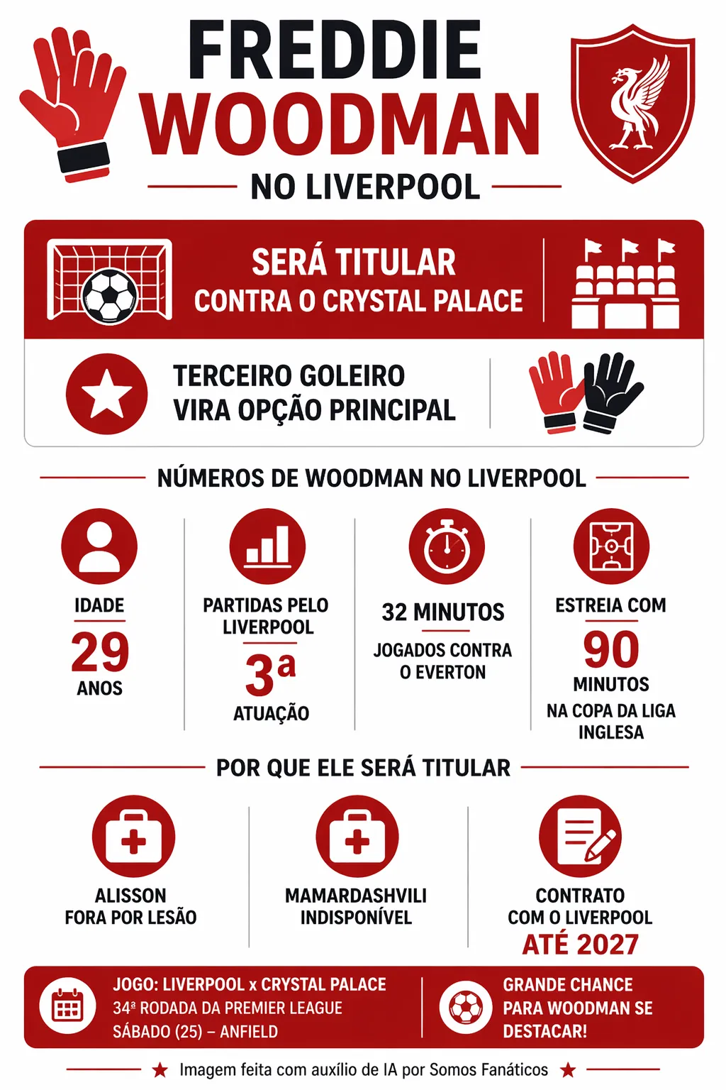 O Liverpool volta a campo neste sábado (25) para enfrentar o Crystal Palace, em jogo da 34ª rodada da Premier League. A partida em Anfield terá uma novidade importante: o goleiro Freddie Woodman será o titular.