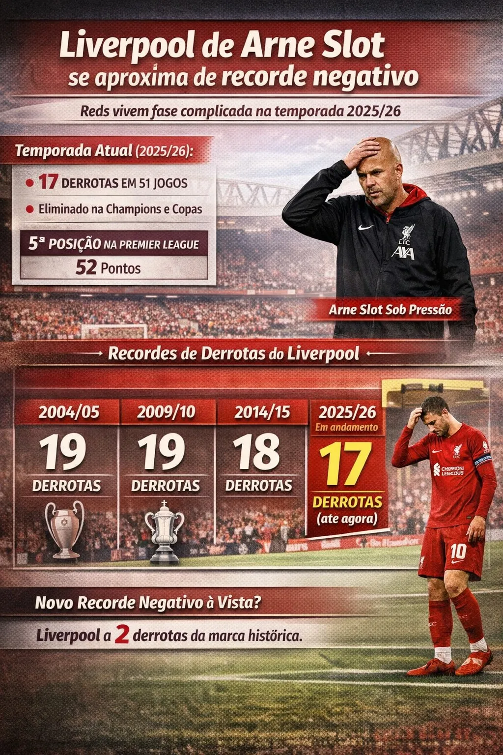 Porém, a temporada 2025/26 do Liverpool, segundo o portal Terra, vem sendo bem diferente da anterior, com os Reds acumulando derrotas, são 17 em 51 jogos disputados.
