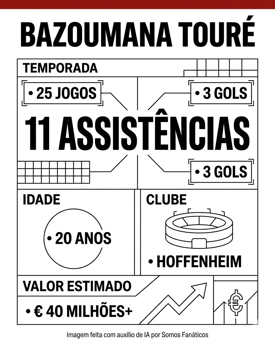 Bazoumana Touré vive uma temporada de destaque pelo Hoffenheim. O atacante soma três gols e 11 assistências em 25 jogos na Bundesliga.