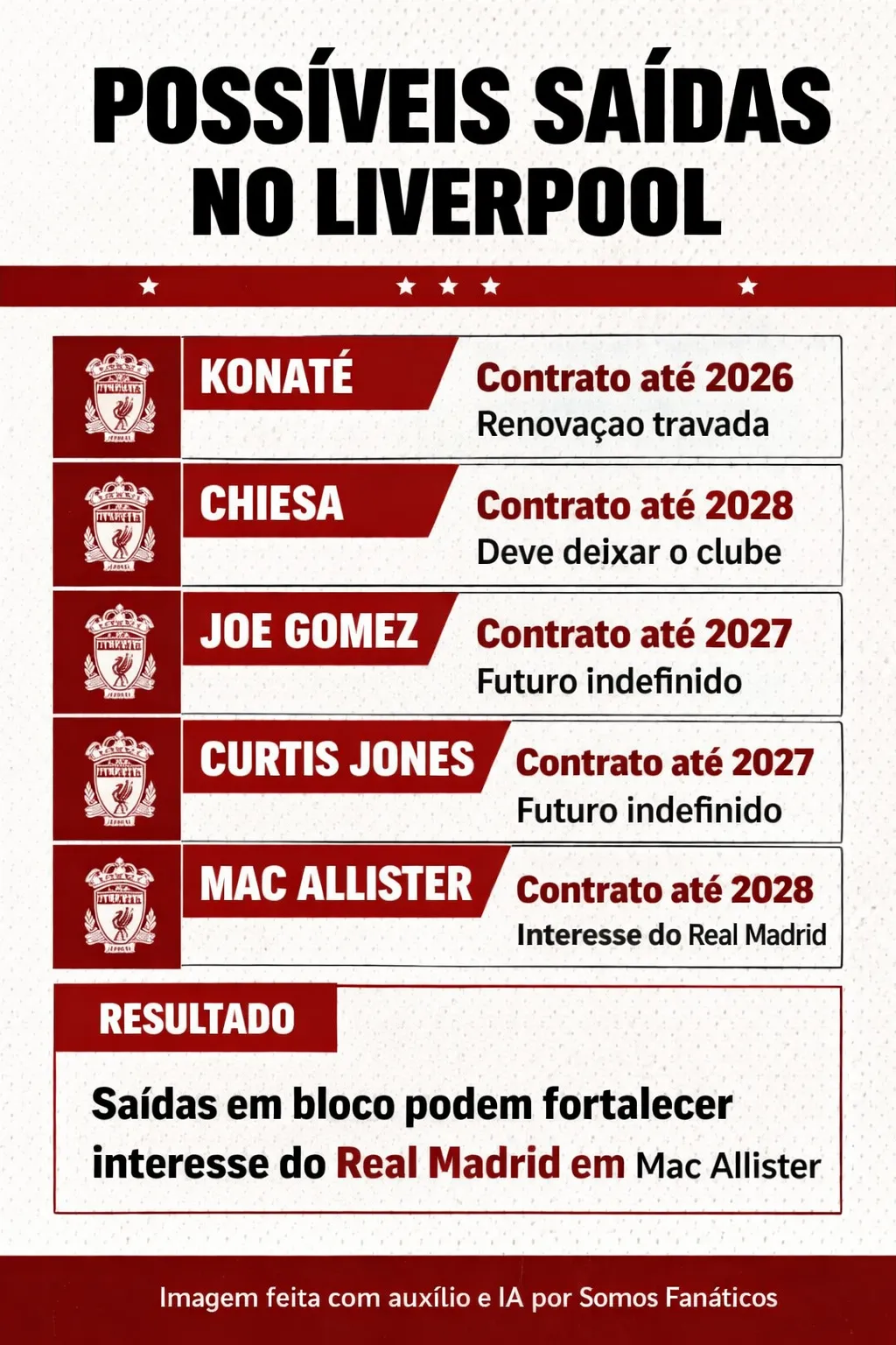 “Outro grande verão se anuncia em Anfield. Chiesa deve deixar o clube. Ainda persistem dúvidas sobre Gomez e Curtis Jones, já que seus contratos terminam em um ano. Ainda não há clareza sobre Konaté, já que as negociações para renovação de contratos, que terminam em junho, continuam”, iniciou.