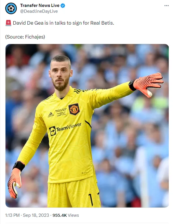 Agora, parece que os dias de inatividade estão prestes a terminar para De Gea, pois o goleiro espanhol está próximo de se tornar o mais novo jogador do Real Betis, da Espanha, de acordo com informações do jornal Fichajes. Vale destacar que De Gea chegaria ao clube sem que houvesse custos de transferência envolvidos.