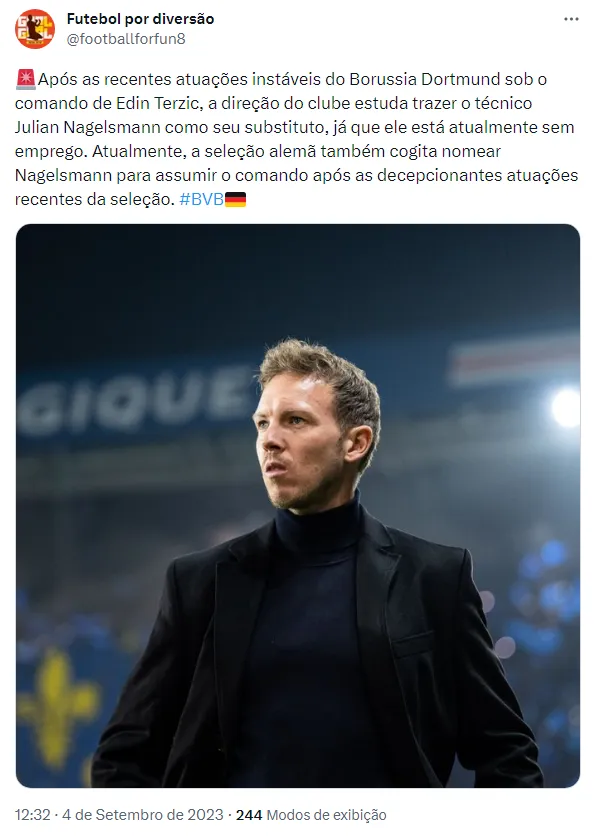 Dessa forma, o nome de Julian Nagelsmann ganha força nos bastidores do Dortmund. Embora Terzic tenha contrato com o clube até 2026, o atual desempenho do treinador não está sendo bem recebido.