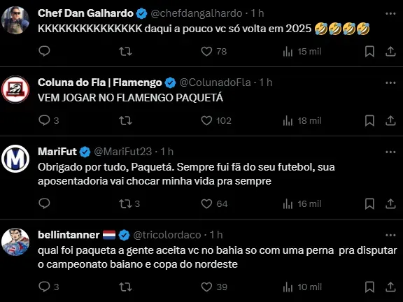 “Que isso gente. Cada hora aumenta um mês. Calma lá”, escreveu o craque do West Ham, na manhã desta quarta-feira (10), na repercussão que teve acesso no Twitter.