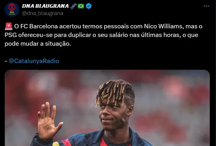 O PSG trabalha para ter Nico, sabe dos valores diante do jogador, mas corre atrás dos concorrentes neste momento, visto que o Barcelona é o clube em que Nico quer jogar na nova temporada.