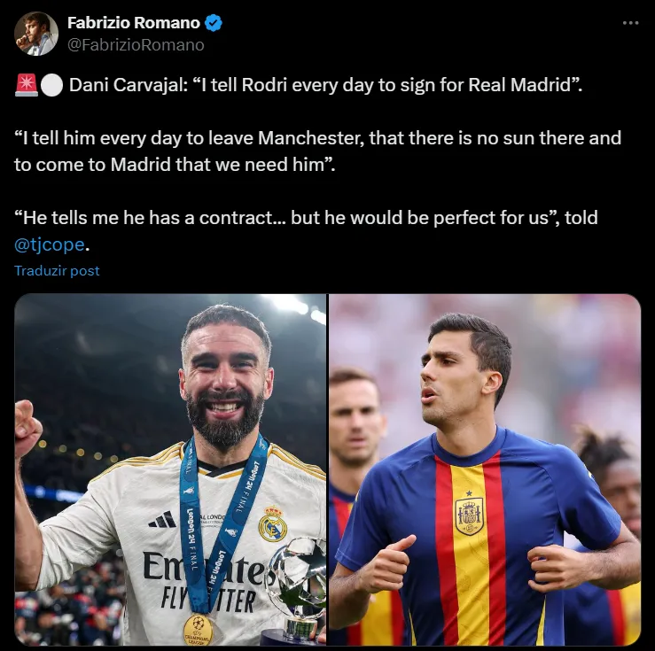 “Eu falo com ele (Rodri) todos os dias: ‘saia de Manchester, não há sol. Venha para o Real Madrid, precisamos de você. Além disso, você é daqui de Madrid” disse o lateral do clube merengue.