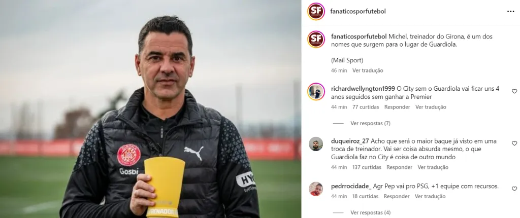 De acordo com a matéria, o espanhol Míchel, do Girona, aparece como um dos possíveis substitutos de Pep Guardiola no Manchester City. Ele fez grande temporada com o modesto clube espanhol.