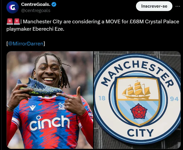 O Manchester City estaria considerando apresentar uma oferta de 68 milhões de libras ao Crystal Palace por Eze, segundo informações de Darren Lewis, do jornal Mirror, da Inglaterra.