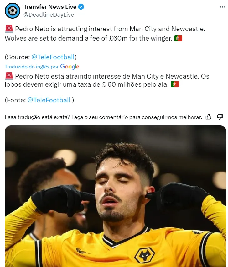O Newcastle também está interessado em Pedro Neto e, por ser clube muito rico da Europa, tem totais condições de brigar com o time de Manchester pelos serviços do jogador.