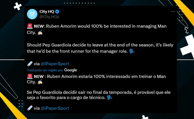 Ainda segundo a reportagem, o Manchester City tem interesse no trabalho do português, o que faz dele o favorito para assumir o cargo de Pep Guardiola. Por sua vez, nenhuma decisão dos ingleses foi tomada.