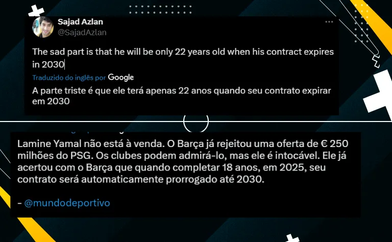 Avaliado em 90 milhões de euros no mercado, o contrato de Lamine Yamal com o Barcelona é válido até a temporada de 2026. De acordo com fontes (Mundo Deportivo), o vínculo do jovem será prorrogado quando ele completar 18 anos de idade.