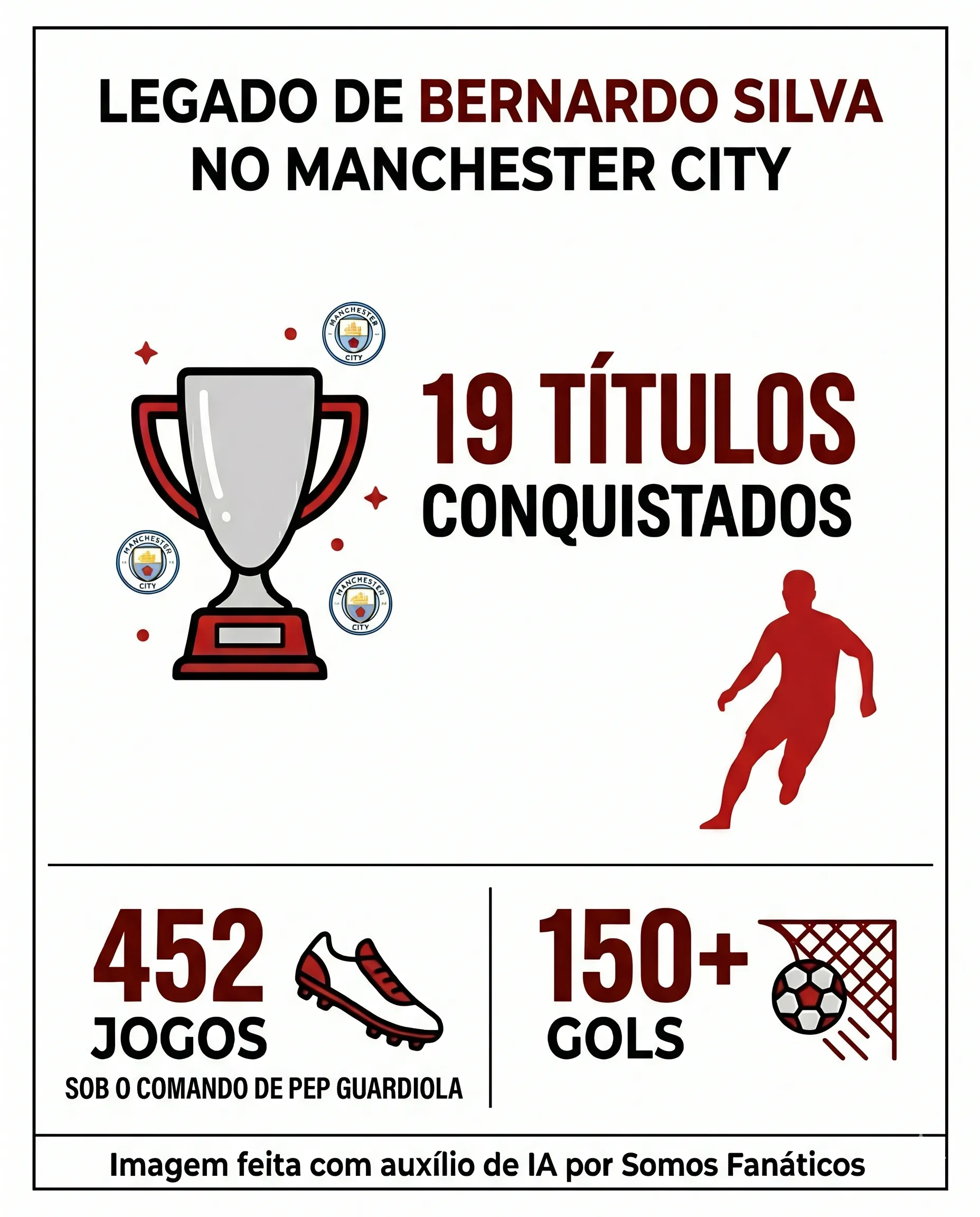 Guardiola também apontou aspectos que, na visão dele, nem sempre foram reconhecidos. “Às vezes, sinto que ele não tem sido visto como uma figura pública. Por causa de sua compleição física, ele não é rápido, não é forte, mas o futebol começa aqui (cabeça) e termina nos pés. Sinto gratidão por tudo o que esse cara fez durante tantos e tantos anos”, disse. Com 452 partidas, Bernardo Silva foi o jogador mais utilizado pelo técnico.