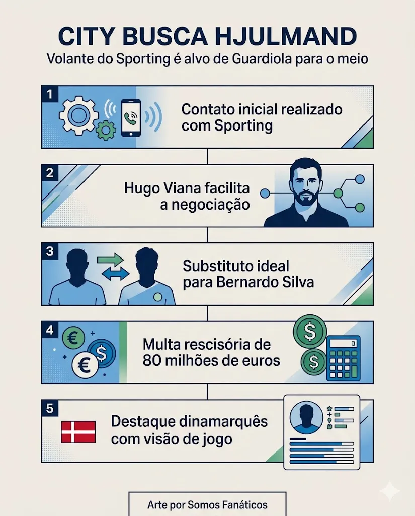 O Manchester City tem demonstrado interesse na contratação do volante Morten Hjulmand. O jogador atua no Sporting de Lisboa e vem se destacando no futebol europeu. Pep Guardiola, técnico do clube inglês, busca reforços jovens para o meio de campo. O objetivo é manter o alto nível da equipe na Premier League. O City quer formar um time mais forte e equilibrado para as competições da temporada.
