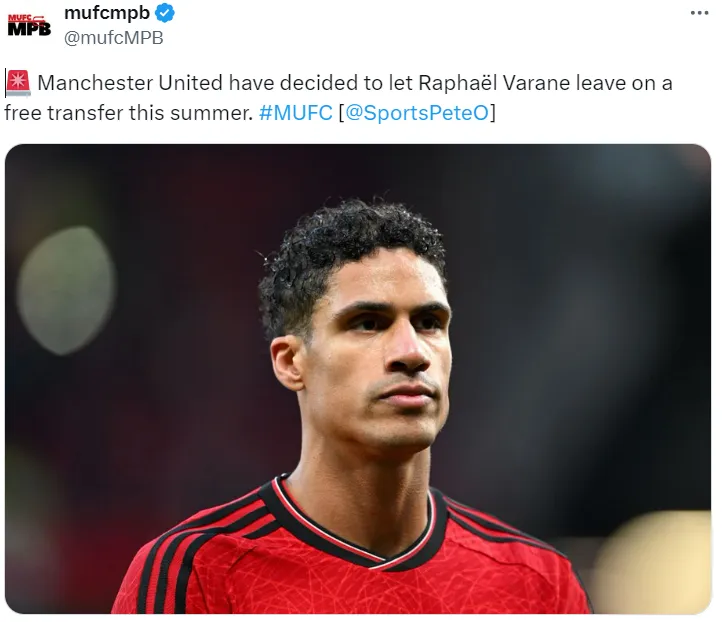 Contratado a peso de ouro para ser o principal defensor do Manchester United, o francês Varane vai deixar o clube no final da temporada, segundo informações de Pete O’Rorke.