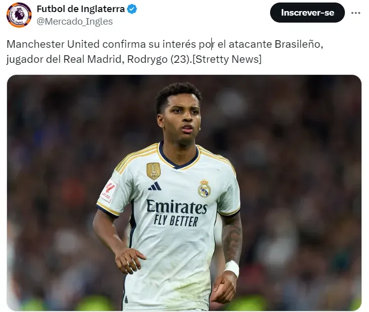 O Manchester United, segundo a imprensa inglesa, confirma que está interessado na contratação do brasileiro Rodrygo, do Real Madrid e da Seleção Brasileira, segundo informa o jornal Stretty News.