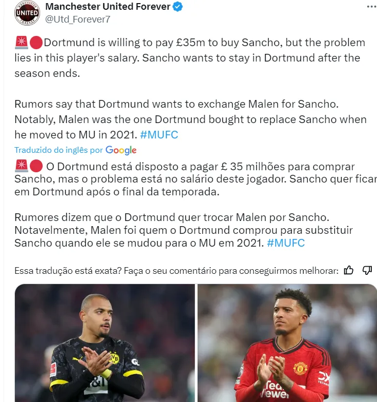 Rumores indicam que uma troca entre Sacho e Malen pode acontecer na próxima temporada, segundo informa o perfil Manchester United Forever, que frisa que a decisão parte por parte do clube alemão.