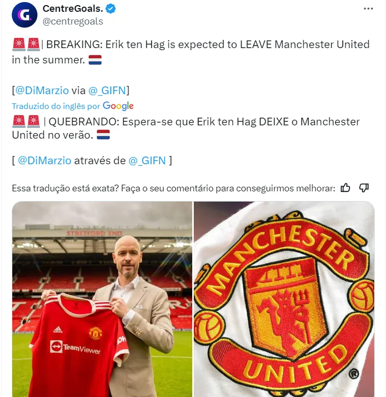 O Manchester United encaminhou a saída do técnico Ten Hag no final da temporada do futebol europeu, segundo informações de Di Marzio. A partida contra o Manchester City, na final da Fa Cup, será o último jogo do neerlandês frente ao clube.