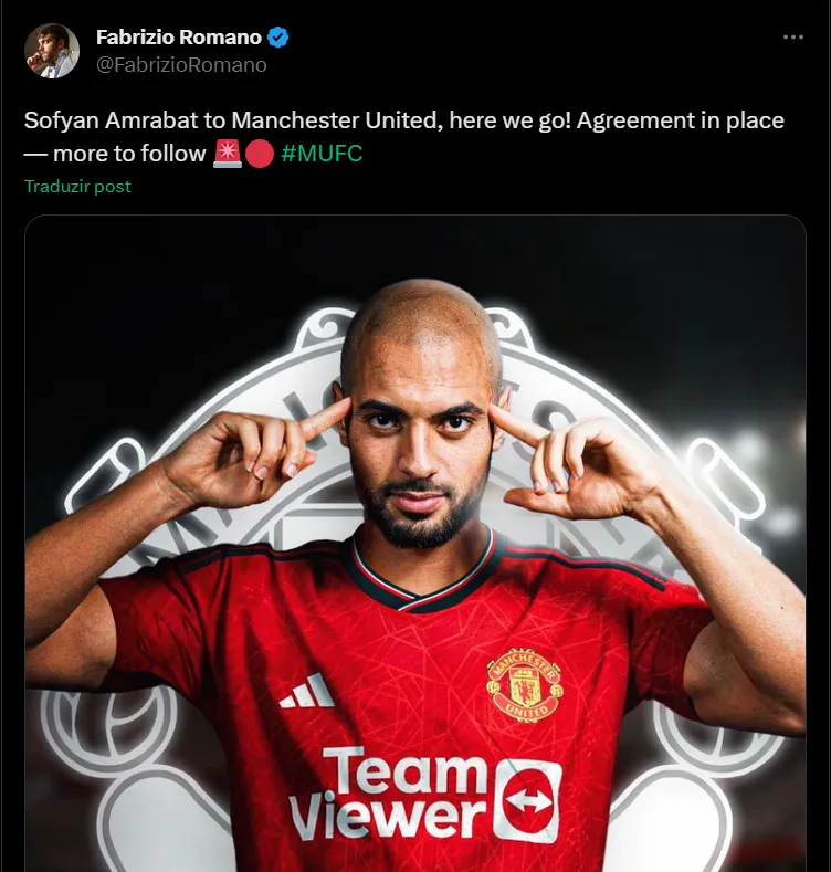 Contudo, o Manchester United fechou a contratação de um volante da Serie A. De acordo com as informações publicadas pelo jornalista Fabrizio Romano, o Manchester United fechou a contratação do meio-campista Sofyan Amrabat, que estava na Fiorentina.