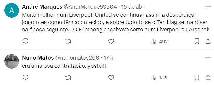 O interesse do time da Premier League é visando a próxima temporada, em meio à necessidade de reforçar o lado direito do time de Ten Hag. Além de Frimpong, há estudos por outros nomes no mercado.