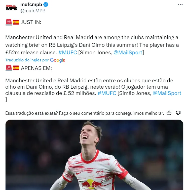 Manchester United e Real Madrid estão interessados na contratação do espanhol Dani Olmo, de 25 anos de idade, jogador do Leipzig, da Alemanha, e também da Seleção Espanhola de futebol.