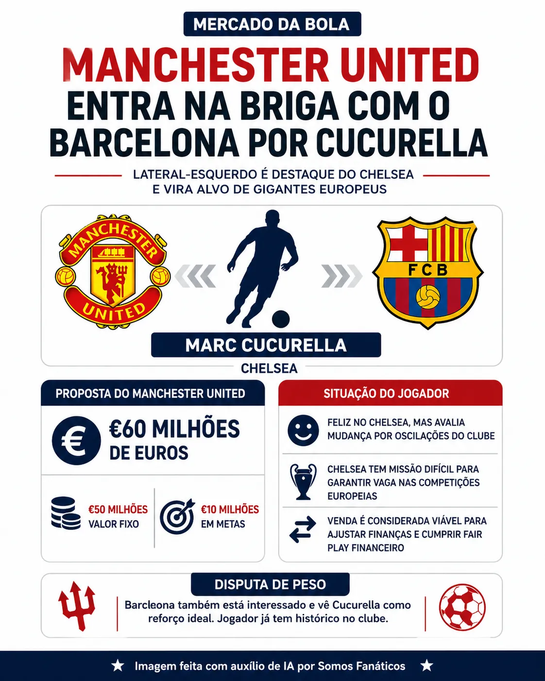O Manchester United promete vir com tudo para contratar o lateral-esquerdo Marc Cucurella, do Chelsea, considerado um dos melhores jogadores da posição no mundo, que também está na mira do Barcelona.