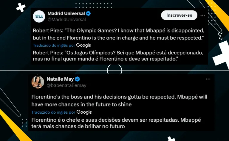 “Os jogos Olímpicos? Sei que Mbappé está chateado, mas no final quem manda é Florentino Pérez e a decisão deve ser respeitada”, disse Pires, que ainda afirmou que o Real Madrid é o maior desafio da carreira do camisa 9.