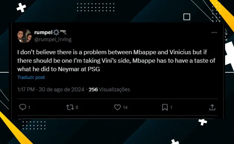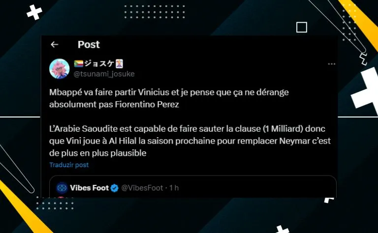 Relatos sugerem: “Mbappé vai fazer Vinicius sair e acho que isso não incomoda em nada (o presidente) Fiorentino Perez. Arábia Saudita é capaz de pagar cláusula (de 1 bilhão de euros)”, comenta internauta.