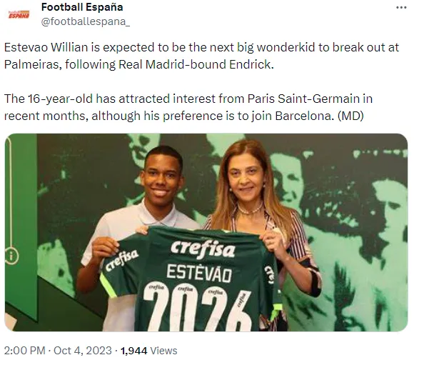 Conforme a fonte mencionada, tanto o Paris Saint-Germain quanto o Barcelona demonstraram interesse no atacante Estevão. Anteriormente, o próprio Estevão havia manifestado seu desejo de jogar pelo clube catalão.