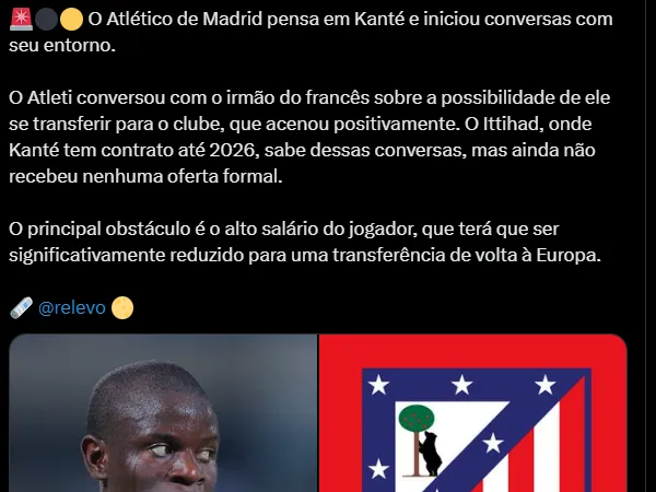 As notícias do Atlético de Madrid nesta terça-feira (13) dão conta que o gigante espanhol iniciou conversas para contratar Kanté e ter o craque francês no elenco de Simeone.