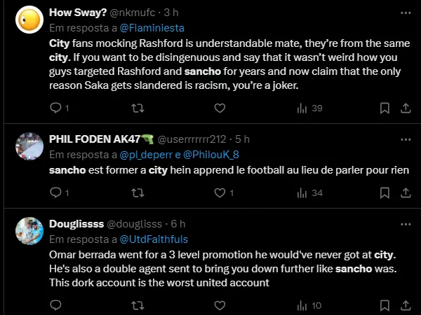 Isso porque a reportagem do Team Talk apurou que um dos acionistas dos Red Devils, Ratcliffe busca opções e ofereceu Jadon Sancho a quatro clubes. Os Citizens foram um desses times.