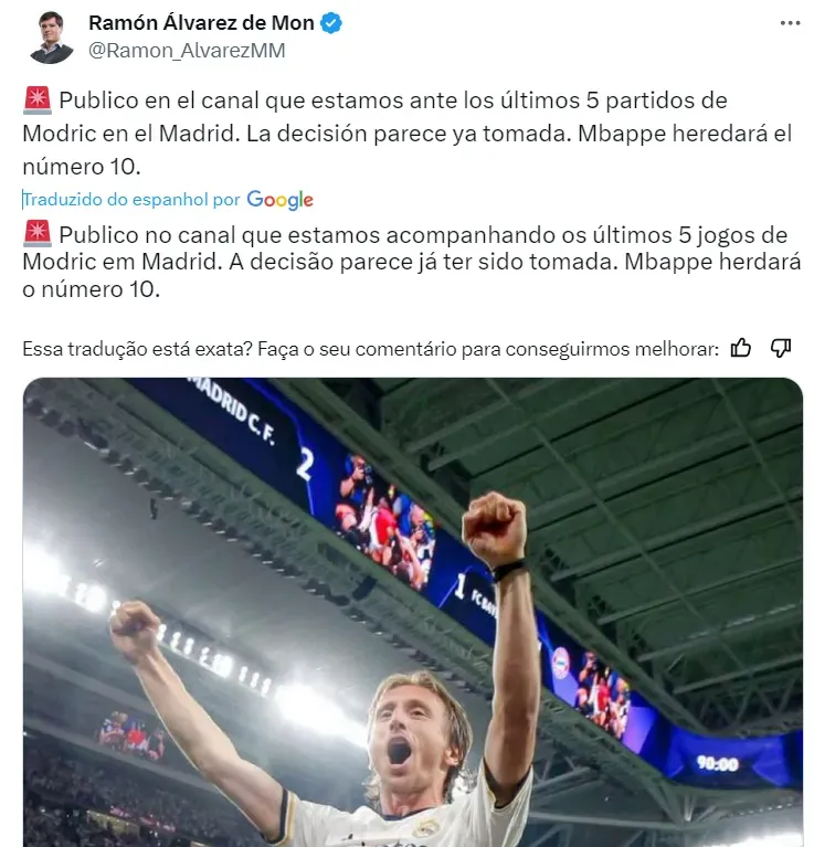 “Publico no canal que estamos acompanhando os últimos 5 jogos de Modric em Madrid. A decisão parece estar tomada”, informa o jornalista espanhol, em sua conta oficial.
